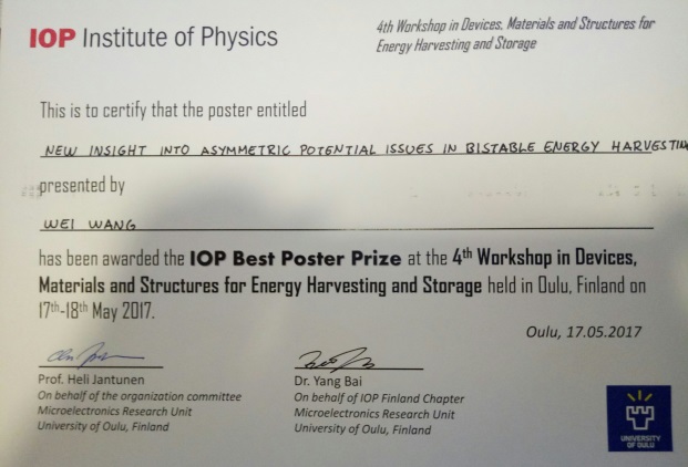 由国际物理学会(Institute of Physics, IOP)和芬兰奥卢大学主办的4thWorkshop in Devices, Materials and Structures for Energy Harvesting and Storage (EHW2017)于2017年5月17日至18日在芬兰奥卢举行。西安交...