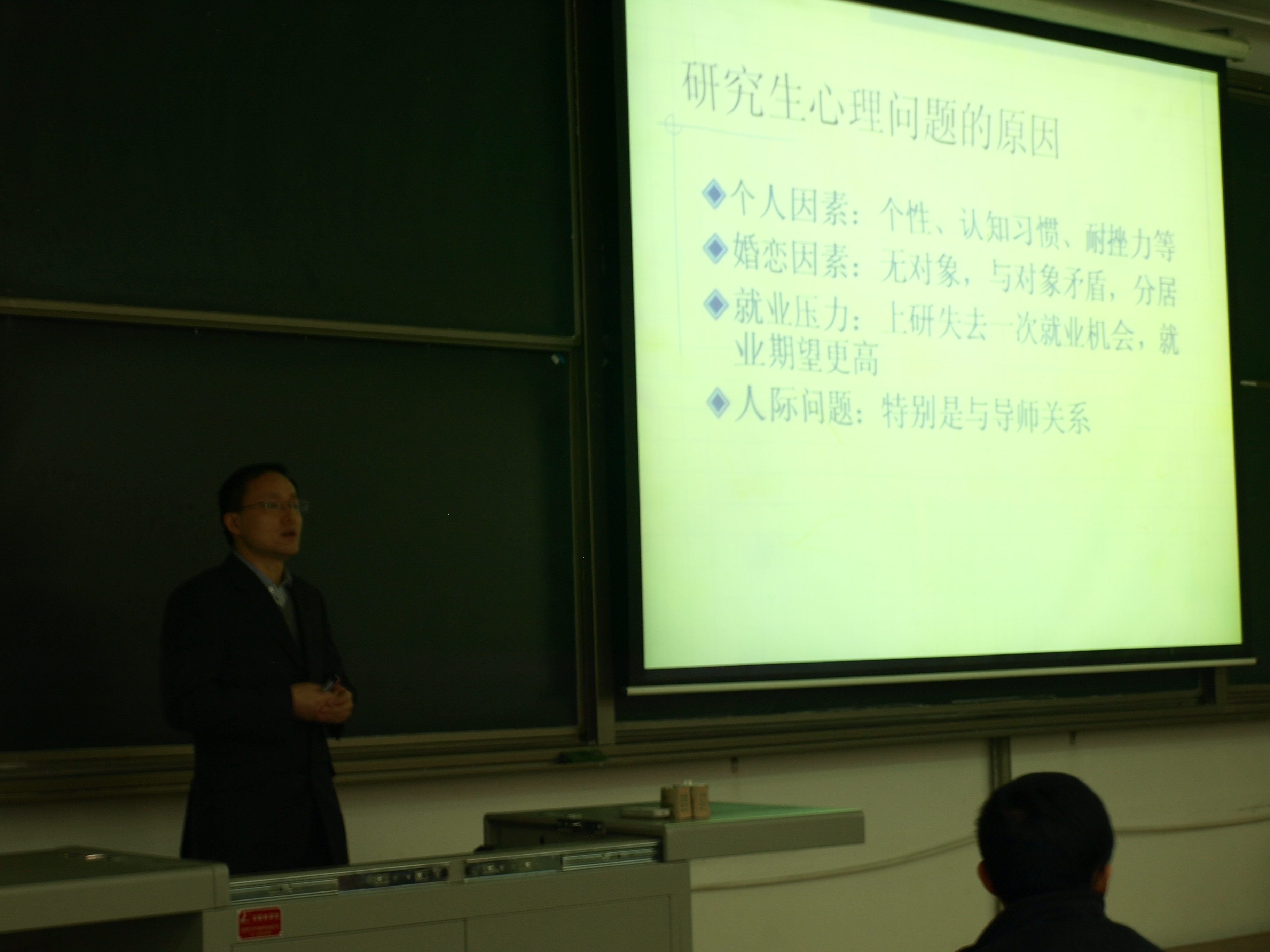 2013年12月25日-27日,万象城awc官网登录入口特邀请万象城awc官网登录入口大学生心理健康教育与咨询中心心理咨询师姚斌博士为全体博士生、硕士生开展了两期关于“研究生心理健康与自我调节”的主题讲座,院党委副书记杨鹏、辅导员雷励、何月...