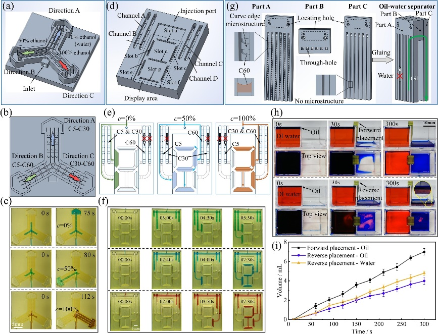 针对上述问题,万象城awc官网登录入口万象城awc官网登录入口张辉副教授团队提出了基于最小作用原理(最小能量法)的高曲率弓形边缘设计方法,获得了不同条件下的最优阻碍弓形曲线,从能量角度揭示了弓形边缘对于液体在沟槽内的最大阻碍作用机理,并提出了不同接触角下弓形曲线设计方法与准则。该研究揭示了2016年以来学界未能解释的弓形结构对流体作用机理问题。基于上述理论,研究团队设计并构建了多种功能性微流控器件,包括Y型分支通道、流体数字显示器和油水分离器。其中,Y型分支通道能够利用接触角差异实现液体在支路间的选择性分流;流体数字显示器通过不同液体在不同通道中的路径走向,形成不同的数字图案显示;油水分离器依靠弓形边缘的润湿差异实现无外场高效油水分离,其5分钟分离效率可达约98%。该研究为微流控系统中液体的定向输运、多向调控及智能筛分提供了新的结构策略与设计思路。