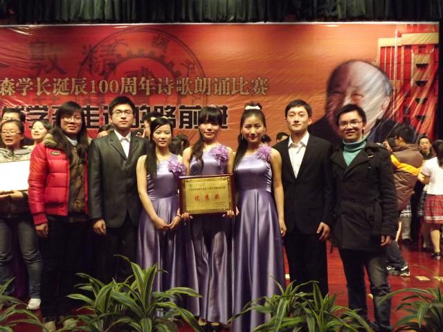 我院代表队由2011级研究生王佳、李杨、吴玲玲、张朝阳、马跃洋等五位同学组成,朗诵作品为周亮同学的原创诗歌——《长路行》。伴随着乐曲,同学们自信饱满,感情充沛,表演动作到位,朗诵时而温婉柔情,时而慷慨激昂。表演过程中,赢得了在场观众的阵阵掌声,并最终获得本次朗诵比赛优秀奖。