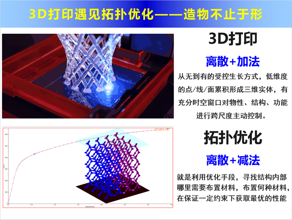 结构技术与造物技术自古以来密不可分,千百年来人类制造技术的绝大多数努力都集中于对形状的塑造,受限于有限的制造技术对精密构型的实现能力,设计方法的潜力难以充分挖掘。本报告将从结构设计技术的发展出发,讲述当前造物革命驱动下,如何材尽其能、物尽其用,实现结构/材料功构一体化、极限化。回溯造物技术从“减材”到“增材”、直至“造物不止于形”的发展轨迹,讲述当两个都是基于离散化描述,但是身处不同领域的3D打印技术与拓扑优化技术相碰撞时,如何释放设计潜力、发挥造物能力的内在逻辑。最后,简要介绍二者结合的几类典型技术应用场景。