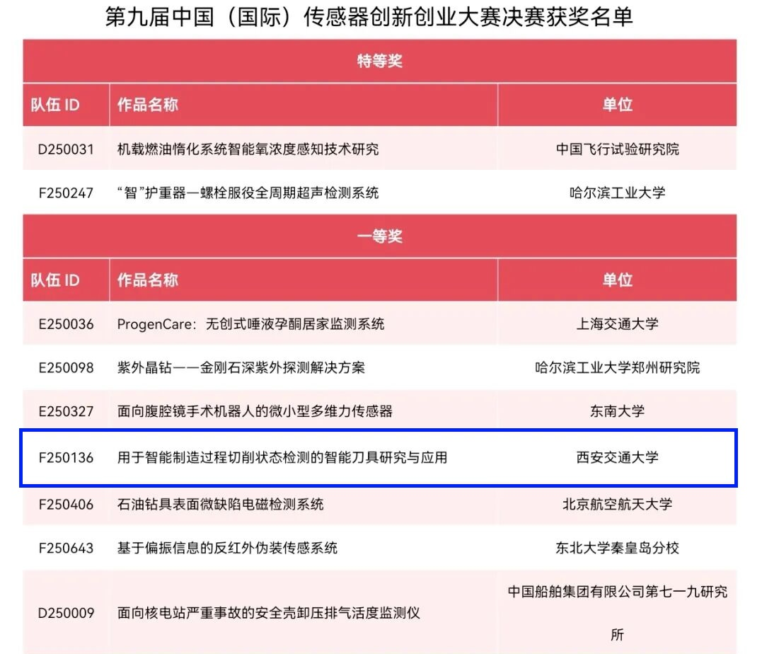 在11月29日举行的第九届中国(国际)传感器创新创业大赛全国总决赛中,我校万象城awc官网登录入口精密工程研究所硕士研究生张烁、李尧(指导教师赵友、赵玉龙)的参赛作品《用于智能制造过程切削状态检测的智能刀具研究与应用》斩获全国一等奖。