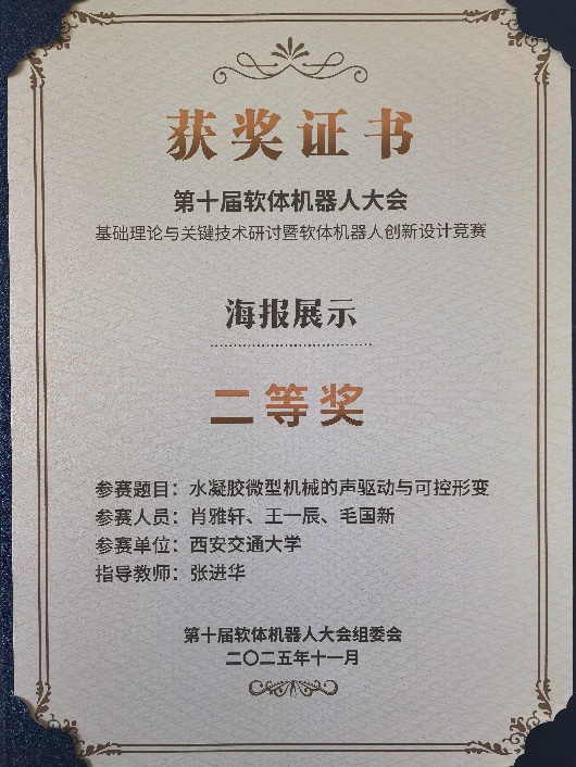 张进华教授课题组长期聚焦软体机器人领域研究,近年来在软体机器人驱动材料、控制算法及应用场景开发等方面取得多项阶段性成果,相关研究论文已发表于IEEE/CAA Journal of Automatica Sinica、Mechanical Systems and Signal Processing、Sensors and Actuators B: Chemical等国内外优秀期刊,此次获奖不仅为课题组积累了竞赛经验,也为后续进一步加强与行业同仁的交流合作奠定了良好基础,未来将继续鼓励学生参与高水平学术竞赛与交流活动,为行业培养更多具备扎实理论基础和创新实践能力的优秀人才。