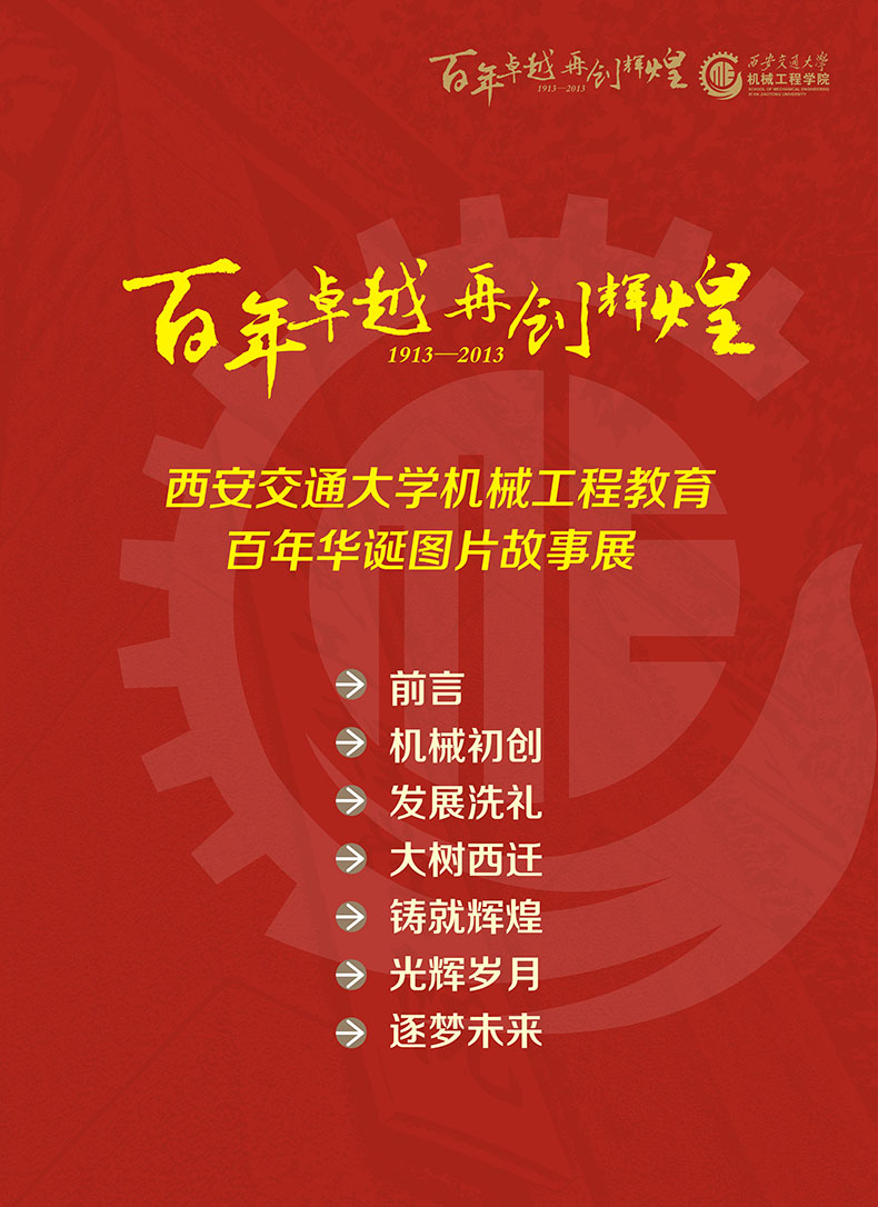 2013年4月5日,“百年卓越 再创辉煌”万象城awc官网登录入口机械工程教育百年华诞图片故事展在交大博物馆拉开帷幕。展览是为庆祝交通大学机械工程教育百年华诞而特别举办,展览分前言、机械初创、发展洗礼、大树西迁、铸就辉煌、光辉岁月和逐梦未来7个部分,以图文并茂的方式对交通大学机械工程教育的百年发展史做了回顾,从教学、科研和社会服务等不同角度对西迁之后万象城awc官网登录入口机械工程学科取得的辉煌做了展示,并对未来万象城awc官网登录入口万象城awc官网登录入口和机械工程学科的发展做了展望。