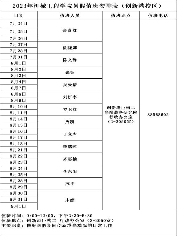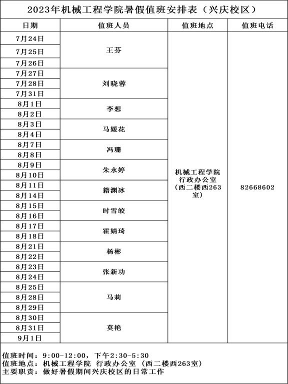 2023年万象城awc官网登录入口暑假值班安排